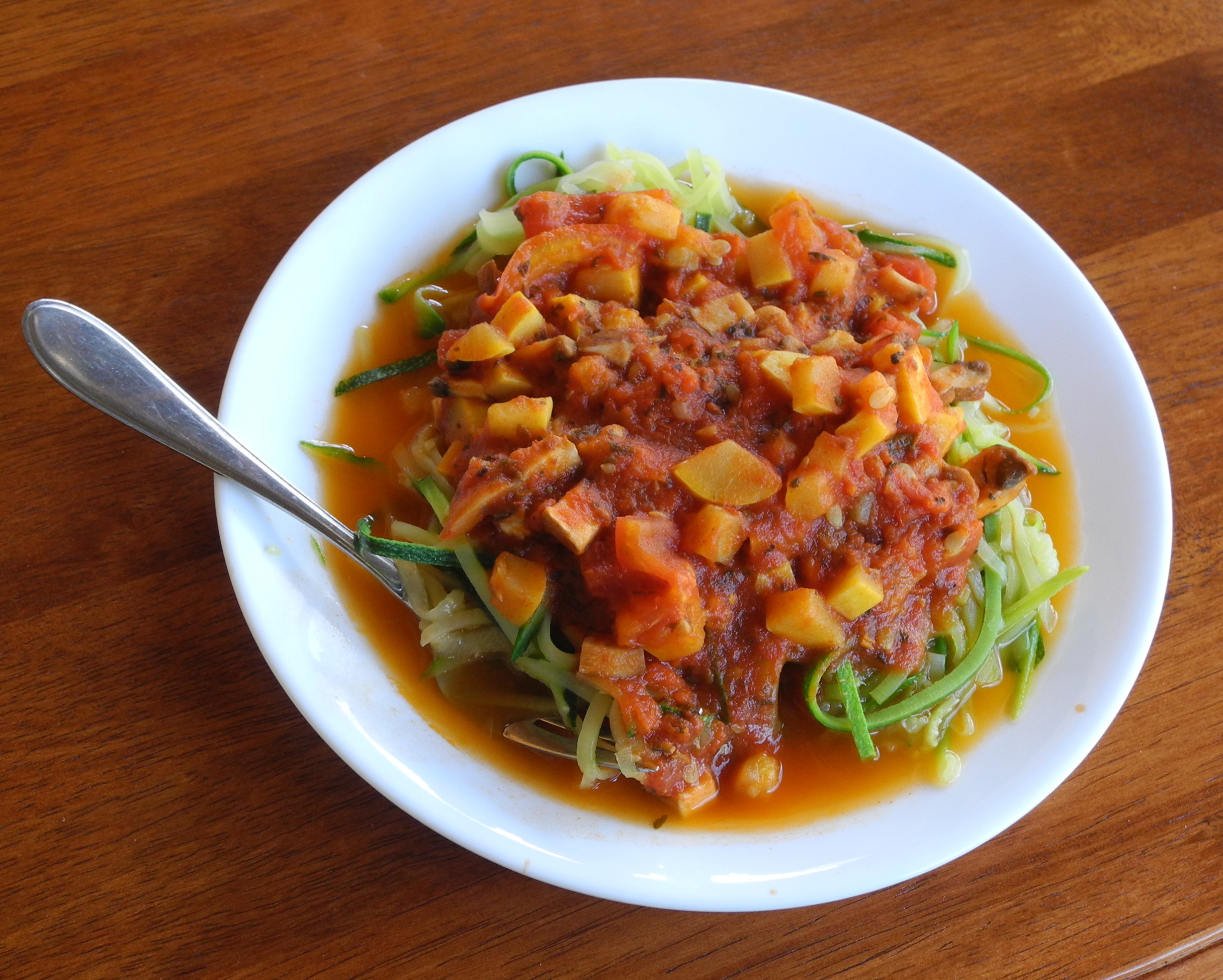 I cubed the summer squash and blanched it, then heated the marinara sauce with the squash, the mushroom, and the tomato (both cut up).