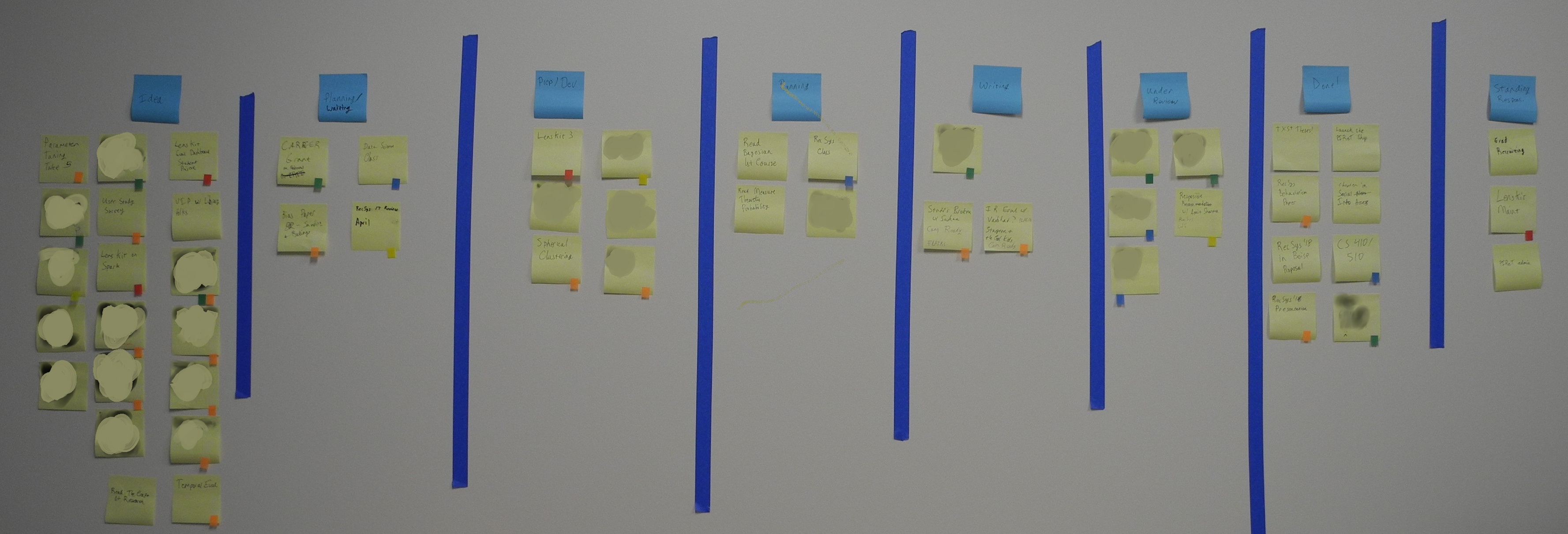 I have thought about managing this in a Trello board, particularly so that I can access it remotely. I might still do that some day, but for now I like its physical nature. Moving sticky notes from column to column is remarkably satisfying.