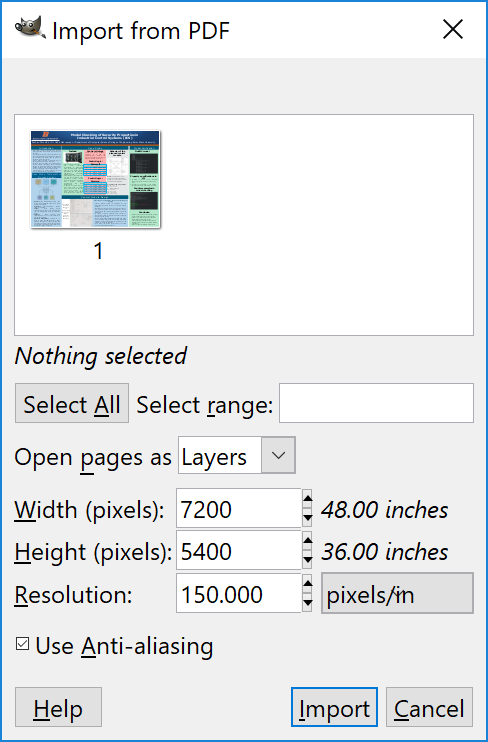 Open The Gimp, and go to File → Open. Browse to your PDF file, and import it. The crucial thing is to set the Resolution to 150.