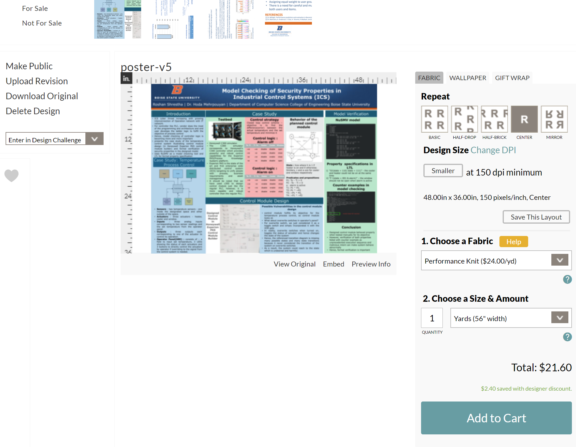 Select ‘Performance Knit’ fabric, and ‘Center’ the image (under the Repeat options). It should confirm that it is at 150DPI, and your poster should look lined up properly.
