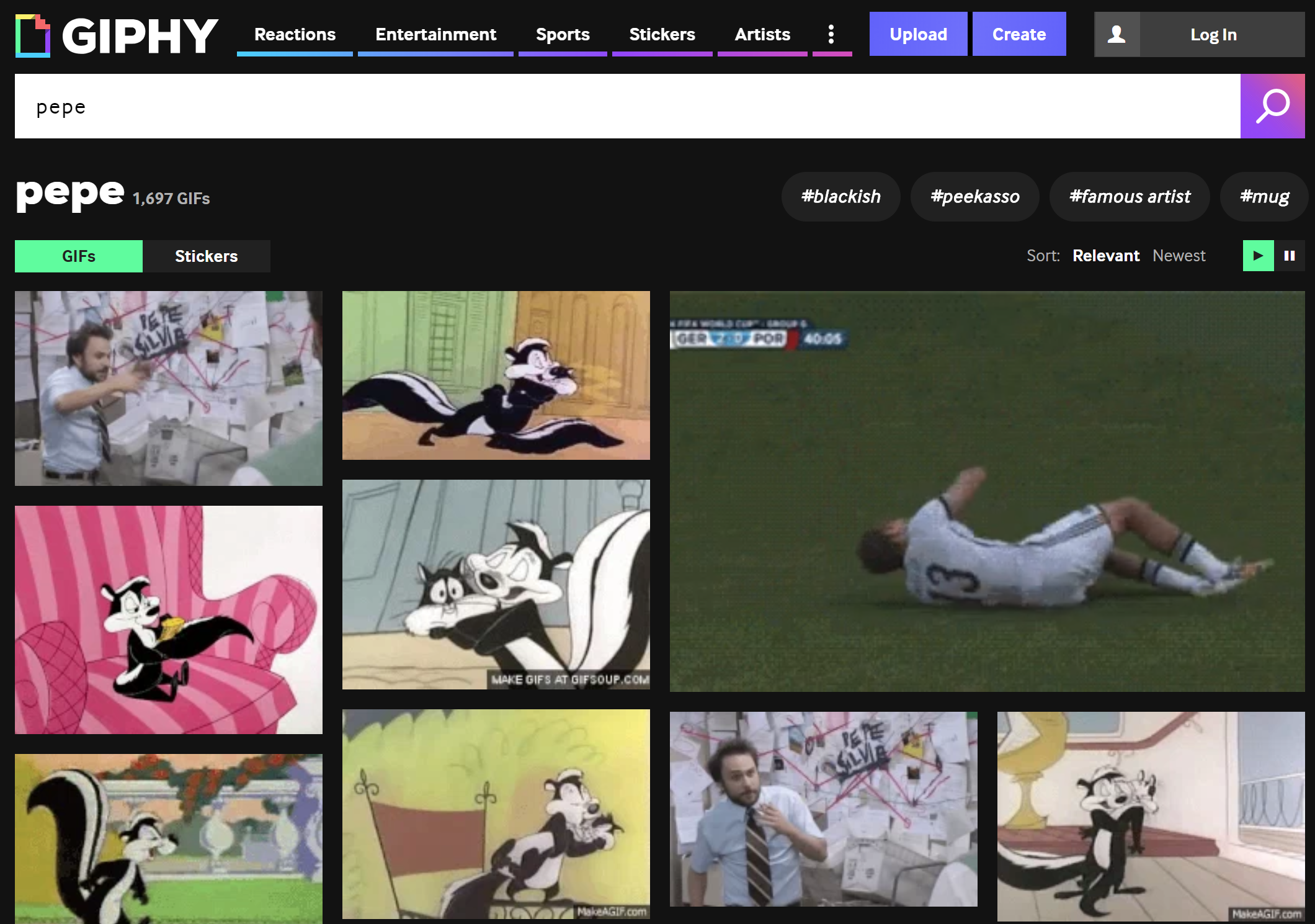 Giphy doesn’t like the frog, but instead of no results, it return results related to soccer and a skunk I don’t recognize: