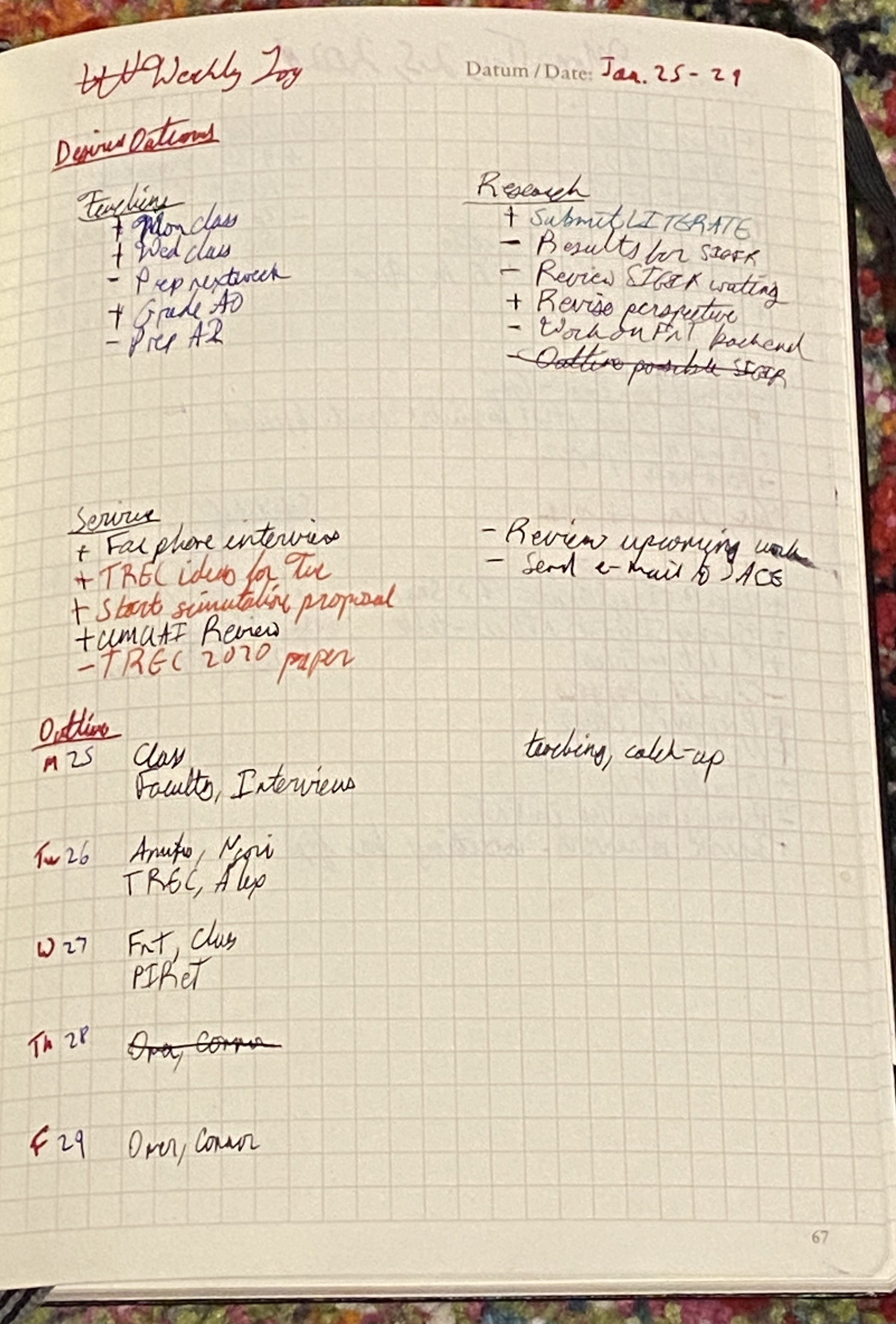 Regular, often physical, contact with my workload helps me keep on top of what I need to do. It also helps my mental and emotional health, as planned times to review my work and plan the next week let me offload things occupying (anxious) brain cycles and rest soundly in the knowledge that they’re captured in a form more reliable than neurons. When I’m feeling particularly underwater, the act of writing down what I need to do helps me find my way out and think, concretely, about what to do next.
