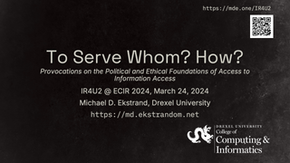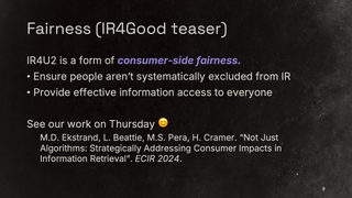My thinking partly comes from working in Boise State with Sole for seven years and seeing how we were approaching different sets of problems from different perspectives, but there also is this fundamental commonality of trying to ensure that IR systems are being good for everybody, being good for children, being good for various providers of the content, etc.