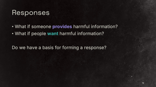 That example is on the provider side, people wanting to provide harmful information, but there’s also then on the consumer side. What if you have people, or coherent groups of people, who want harmful information and they believe that it’s true information? We’ll talk more about that in a little bit. But how do we start to wrestle with these? Where can we go?