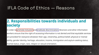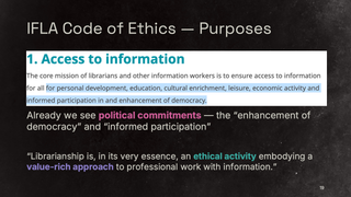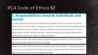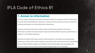 In the prologue to the IFLA code, it motivates the whole code with the claim that librarianship is in its very essence an “ethical activity embodying a value-rich approach”. So the whole code is premised on the idea that information work is not a value-neutral endeavor.