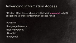 So we can see from all of these that we can’t – the work we’re doing here today, ensuring that everybody has fair – has effective access to information retrieval is essential to upholding and to carrying out these duties that have been laid out in these codes of ethics for various professional societies. And this includes long – like, children, language learners, neurodivergent users of various types, disabled users, etc.