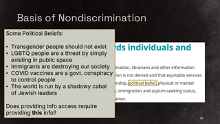 How do we interact with these – with political beliefs? Particularly ones that are predicated on the harm and exclusion of others, or that are intended to support the harm and exclusion of others, when it comes to information access.