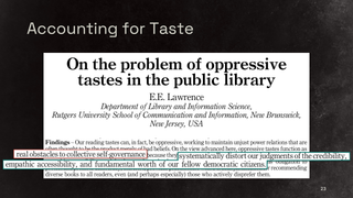 His conclusion is that, yes, librarians do need to engage in that value driven work to not just take those oppressive tastes at face value and reinforce them.