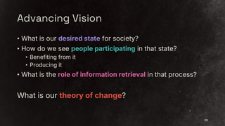 All of us have a theory of change. We just don’t necessarily talk about them. But a theory of change partly consists of what desired future we’re trying to work for — everyone can access information retrieval or the future that we want that to build to. And also, we’re taking specific actions in order to try to bring that world about. Why?