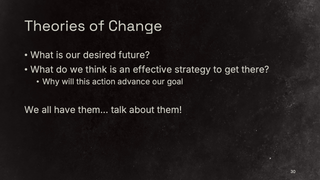 The theory of change gets us to why do we believe that this action is going to bring us closer to that desired end state? Different theories of change will lead to different actions to the same desired end state.