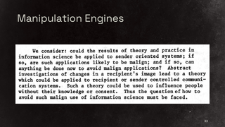 But this paper, a criminally undercited paper by Belkin and Robertson in 1976, they were concerned with the ability for findings in information science to be used against the users. The work we’re doing on how to facilitate people accessing information, how can that be misused particularly to what they called sender-oriented systems? Propaganda machines.