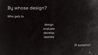 And are people being designed for or being designed with? This is one of the big challenges I would like to see information retrieval work on in the next five, ten years. How do we enable people to design the information retrieval systems they interact with, not just use the ones others have designed?