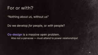 The really short summary is that I’ve come to believe as I’ve been wrestling through various problems in algorithmic fairness, that the reasons why we’re trying to pursue things like providing information access to understudied users, providing fair information access and all of the complexity and everything that that means, that the reasons why we’re doing it can provide really valuable guidance for navigating trade-offs, for wrestling moral complexities that arise, for understanding the limits of when this tool is not the right tool for the job.